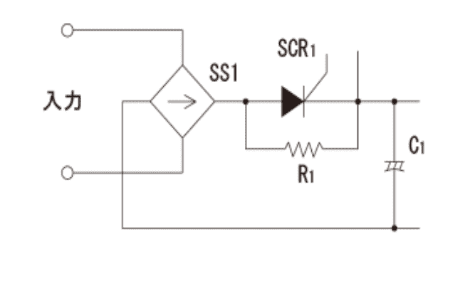 最初は抵抗だけ突入電流を抑え、平滑コンデンサの充電が終わった頃にSCRをONして、抵抗の損失をなくします。