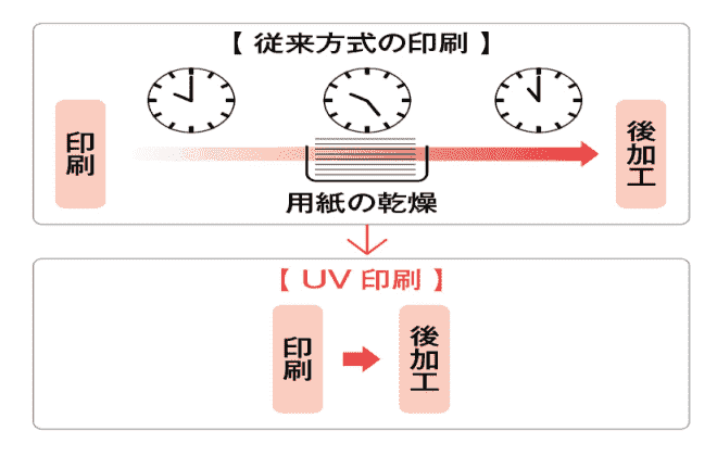 UV印刷は一瞬でインキが乾くため、乾燥待ち時間が不要。