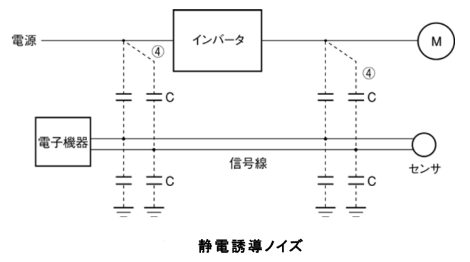 ノイズ電流の流れているインバータの入力側や出力側の電線に周辺機器の電線や信号線を近付けると, 電磁誘導(図-11)や静電誘導(図-2)によって周辺機器の電線や信号線にノイズが誘導されます。 これが④の誘導ノイズです。